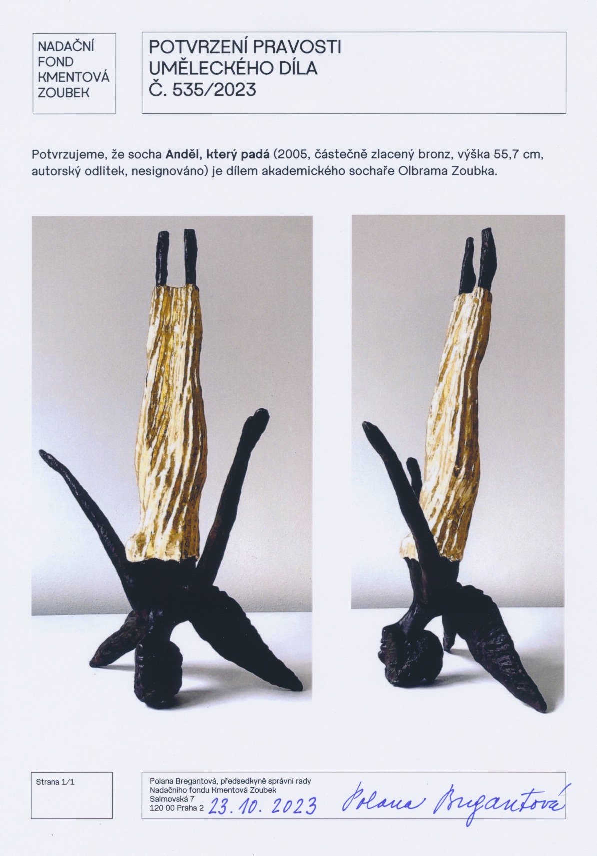 Olbram Zoubek zlacená bronzová socha, nesignováno, posouzeno Nadačním fondem Kmentová Zoubek.